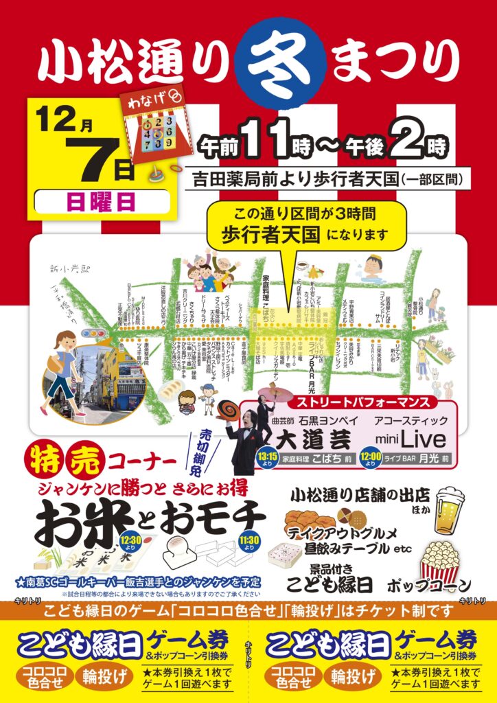 ★小松通り商店街の冬まつり!テイクアウトグルメや子ども縁日もあり、特売コーナーではお米やおもちもありますよ。楽しい冬まつりにぜひ遊びにきてください♪
