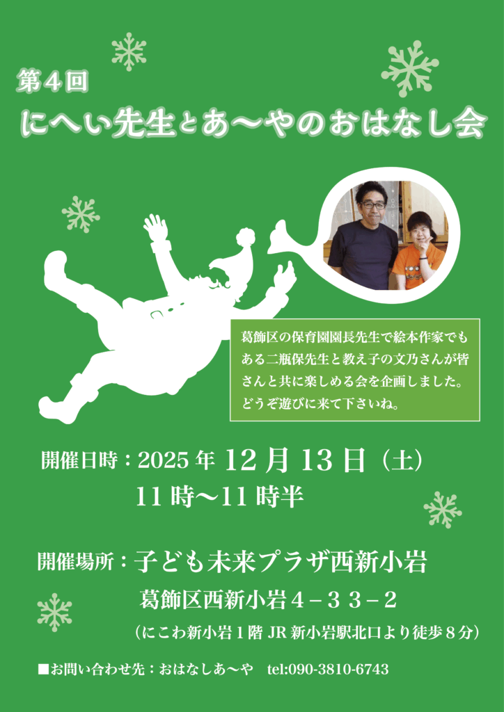 葛飾区の保育園園長先生で絵本作家でもある二瓶保先生と教え子の文乃さんが皆さんと共に楽しめる会を企画しました。どうぞ遊びに来て下さいね。